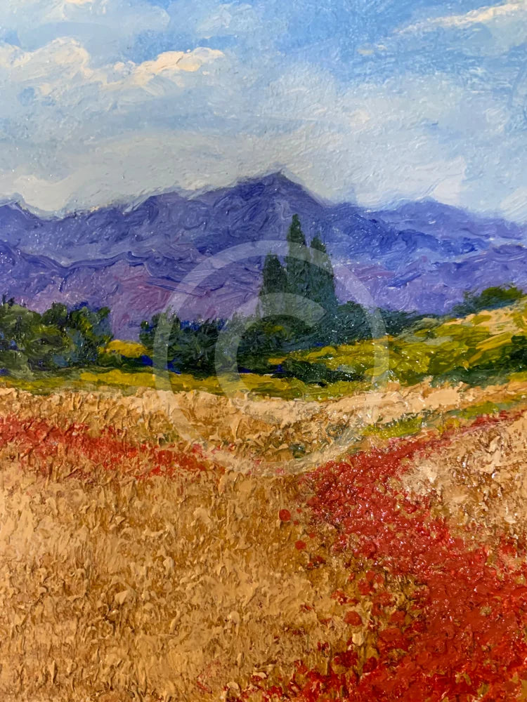 Here poppies bask in a golden field, with the beautiful blue skies and sunshine of a summer in Provence behind. Doesn’t it make you want to have a holiday there?