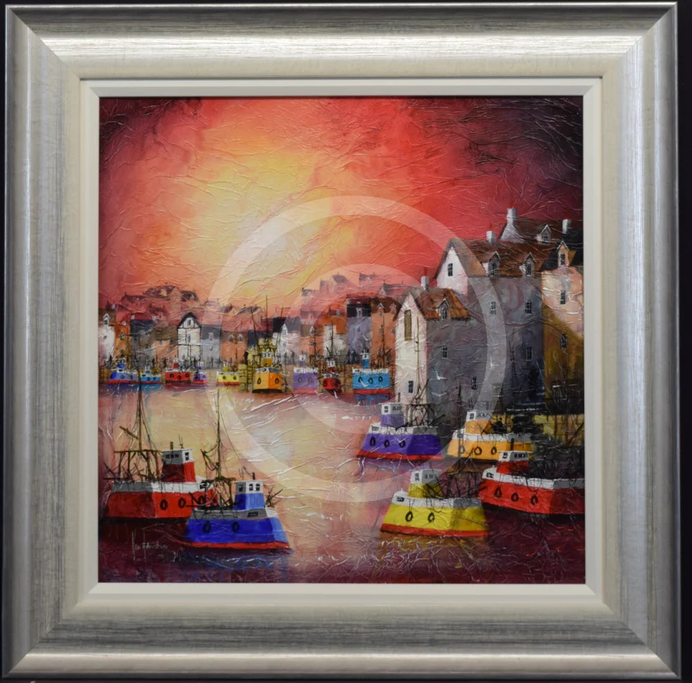Be mesmerized by this breathtaking original painting by Ken Hammond. Watch as the sun melts into the orange light of the bay, casting shadows across the evening sky.