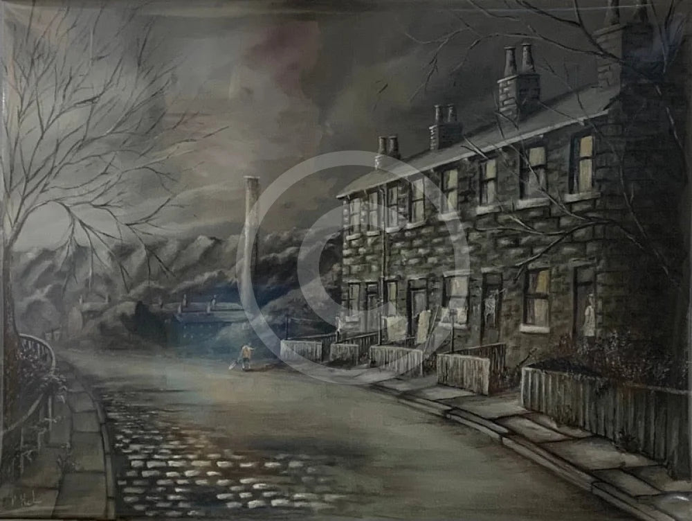 A atmospheric, nostalgic memory of life in a northern mill town. Mum shouts ‘Tea’s Ready!’ to her son playing on the cobbled street outside. Washing dries on the line in the yard outside, beneath a grey smoky sky. A splash of colour against the grey is provided by little Jimmy’s hand knitted tank top.
