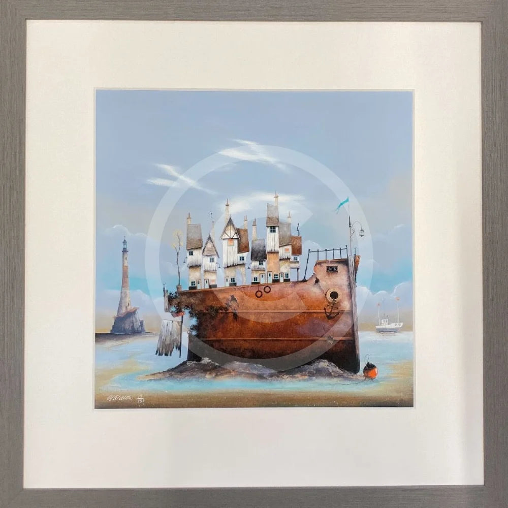 Gary's little buildings head off on an adventure, perch atop their rusty ship, just about floating in the sea! One of Gary's signature lighthouses sits on the horizon.