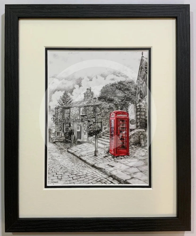 Showing the red telephone box outside The Black Bull on Haworth’s cobbled Main Street. The famous Brontë Parsonage is behind the church on the right of the picture if you’re planning to visit this picturesque West Yorkshire town.