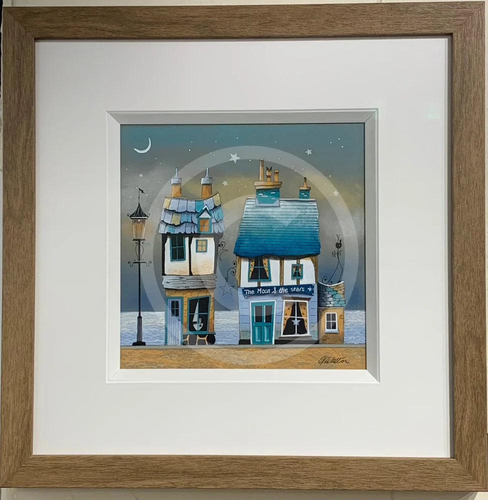 Gary’s designs are whimsical - full of humour and imagination - whilst his chosen colour palette of blues and browns is gentle and calm. In the image we see two quirky buildings standing side by side on the beachfront. One has a sign along its front saying The Moon and the Stars. They are very typical of Gary’s distinctive style with their bowed roofs and their doors and windows out of alignment. A traditional lamppost stands to the left and the sea glitters beneath a crescent moon and a glowing sky filled with stars.
