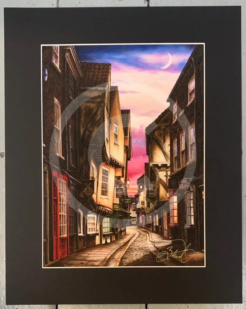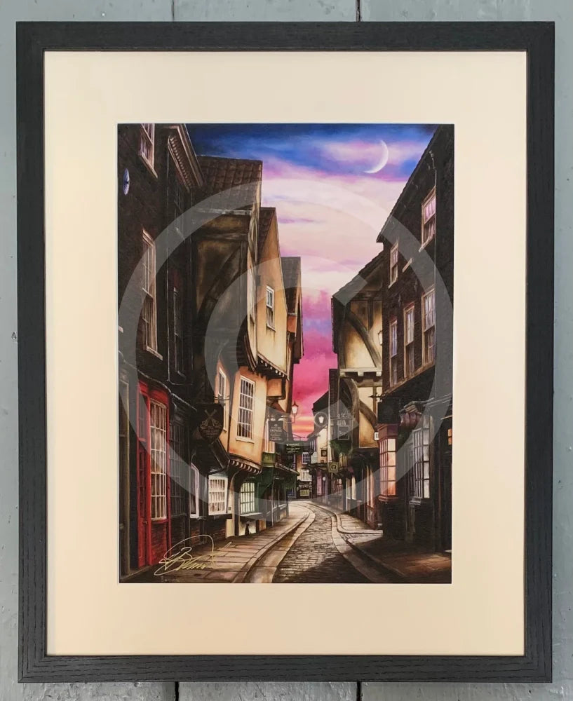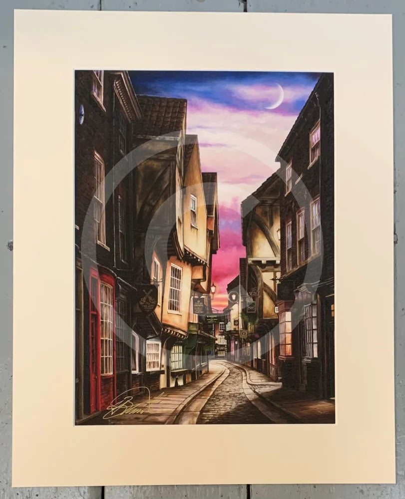 Following the sell out success of Mark's classic daytime print of The Shambles, the artist has produced this stunning view of York's most famous street, captured in the striking colours of twilight.