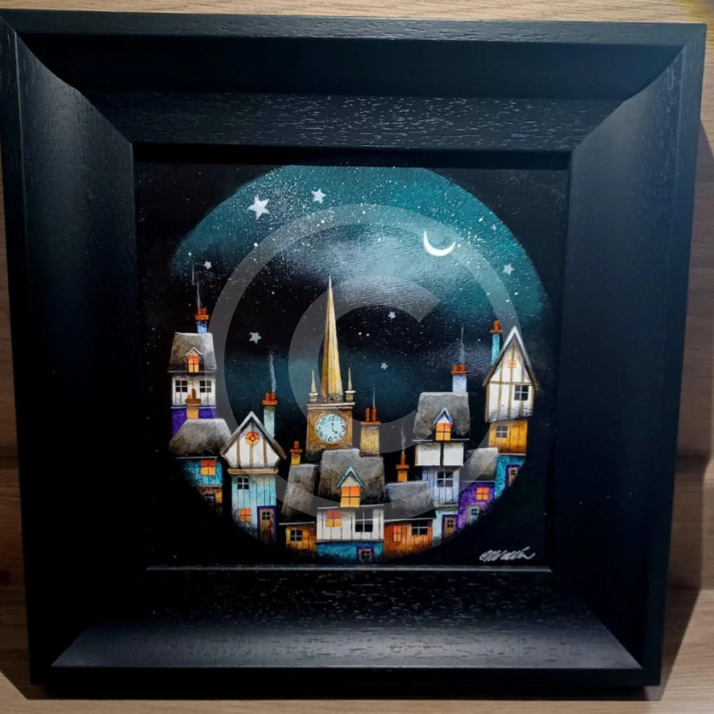 Painted in a circular porthole effect on a square, black painted board, Gary has painted a quirky medieval town inspired by his wanderings around York whilst visiting the gallery.