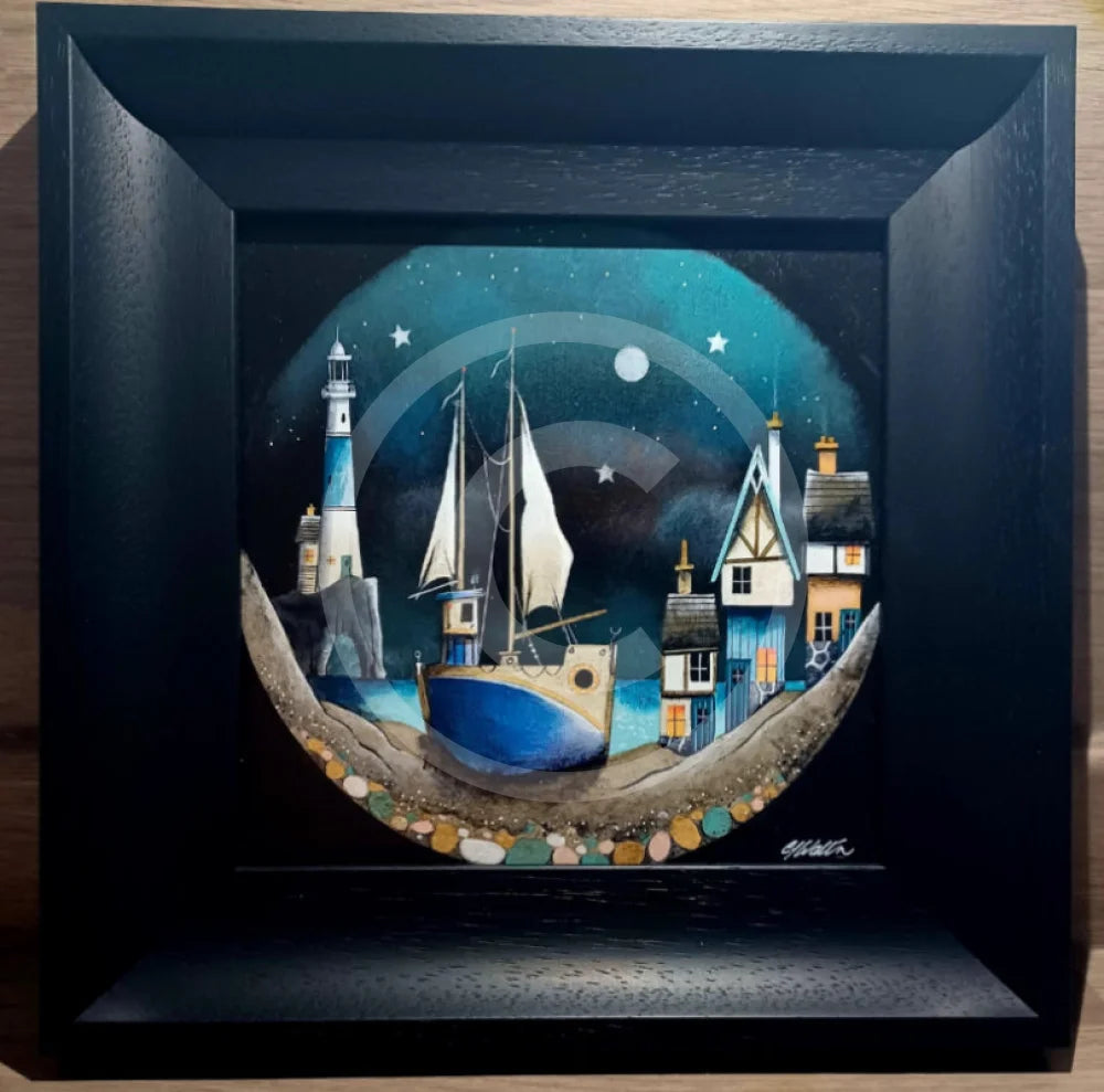 Painted in a circular porthole effect on a square, black painted board, The Three Stars features a little blue fishing boat, grounded on the beach in front of a group of Gary's signature houses. A lighthouse sits on the deep blue horizon, whilst the moon and stars twinkle overhead.