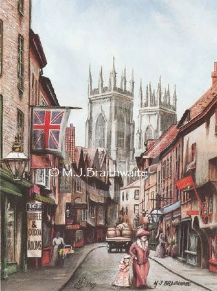 One of the initial paintings from M.J. Braithwaite's York Collection, researched from archive photographs of York in the reign of Queen Victoria, it is one of a series of four pictures which make up "The Victorian York Collection".