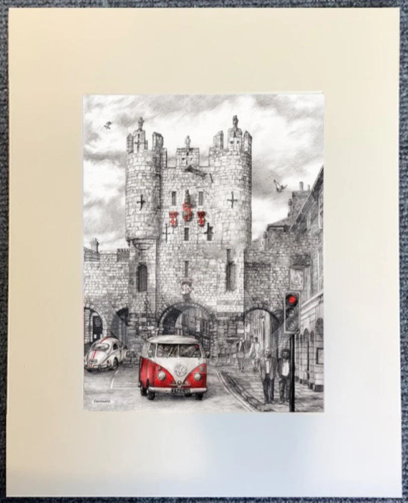 A red VW Camper waits outside Micklegate Bar, whilst a VW Beetle drives underneath.