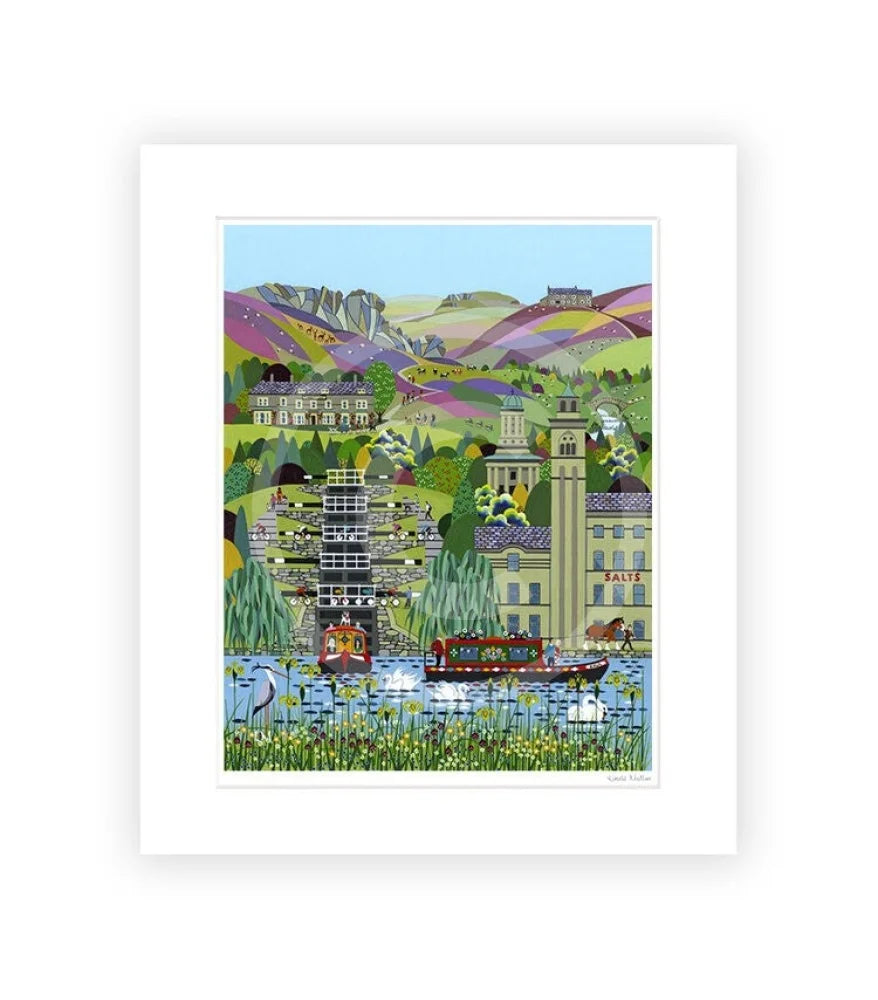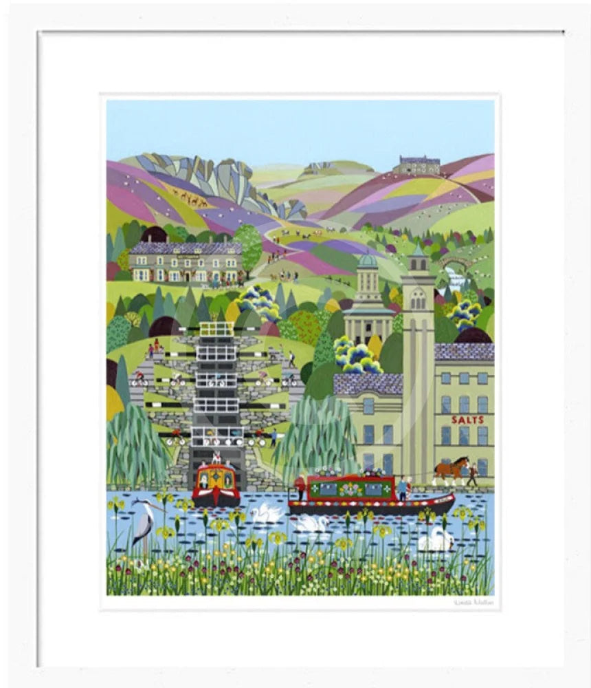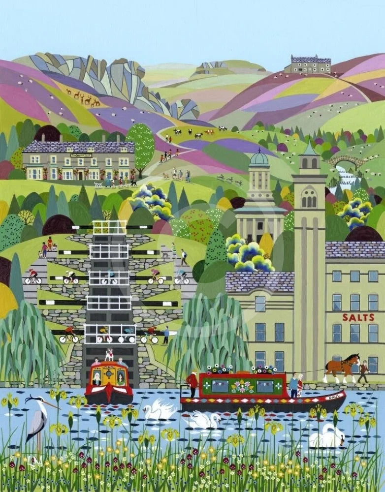 Landscape features include Pen-y-Ghent, The Tan Hill Pub, Cow and Calf Rocks at Ilkley, The Cow & Calf Pub, Bingley Five Rise Looks, Salts Mill at Saltaire, and the Leeds & Liverpool Canal. What else can you spot?