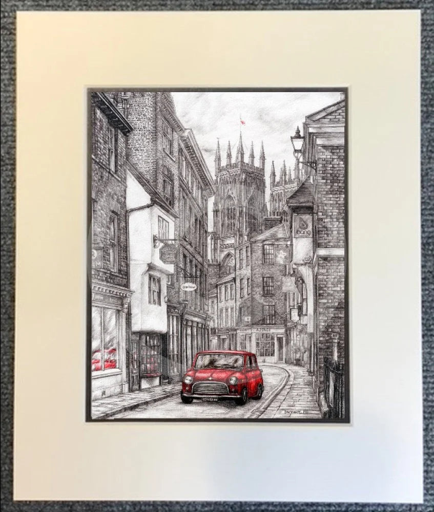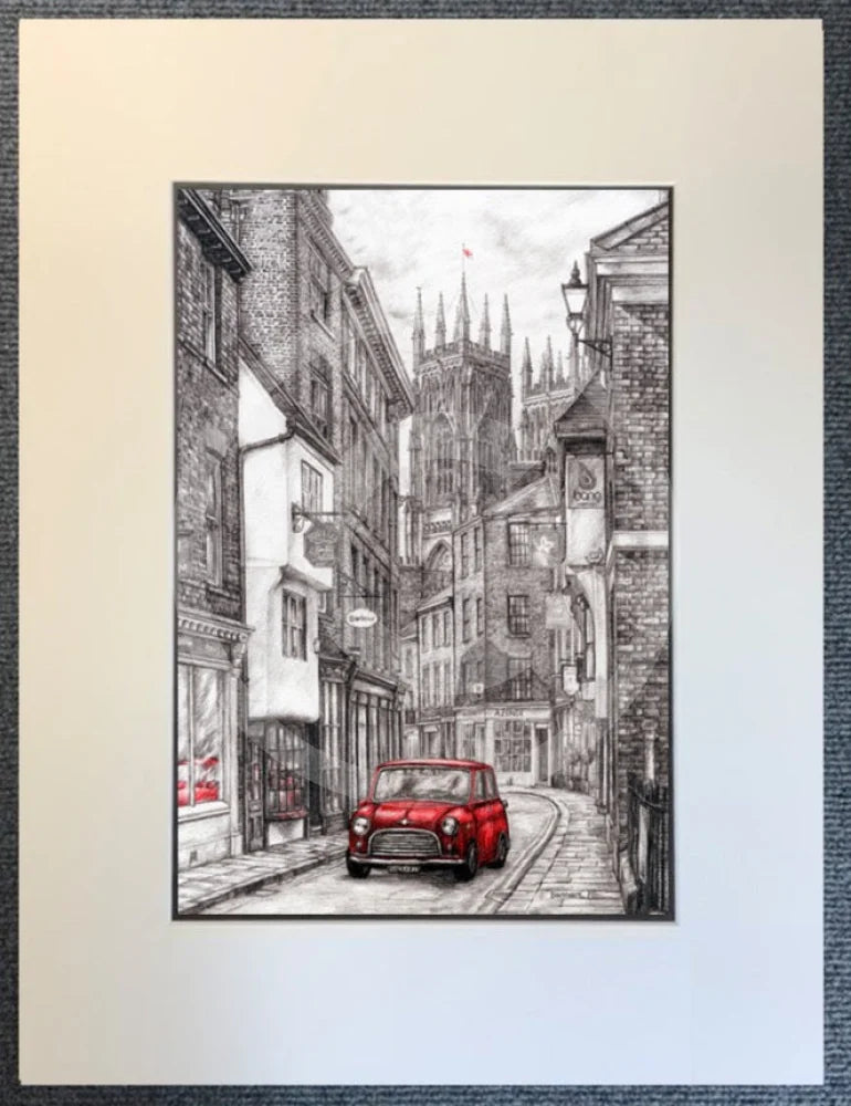 A red mini ventures down Low Petergate! York Minster towers over the street, whilst the flag of St George flies over the Southwest tower.