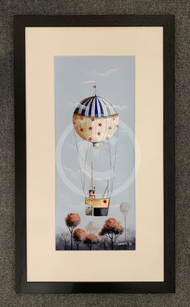 Gary's whimsical little boat floats across the treetops, held aloft by a hot air balloon adorned with stars and stripes.