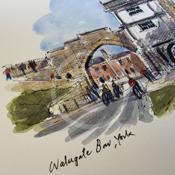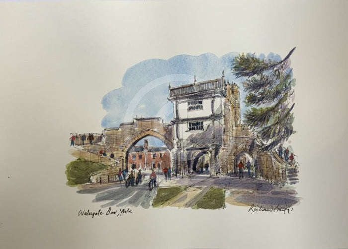 An original line and wash watercolour illustration on paper by artist Richard Briggs. This beautiful cityscape painting of York captures visitors enjoying the historic Walmgate Bar, York’s most complete and recognisable Bar. It still comprises its defensive Barbican, portcullis and oak doors an is the only town gate in England to survive with its Barbican intact. This original painting is signed by the artist and is presented purely as a painting on paper, but can be mounted and framed if required.