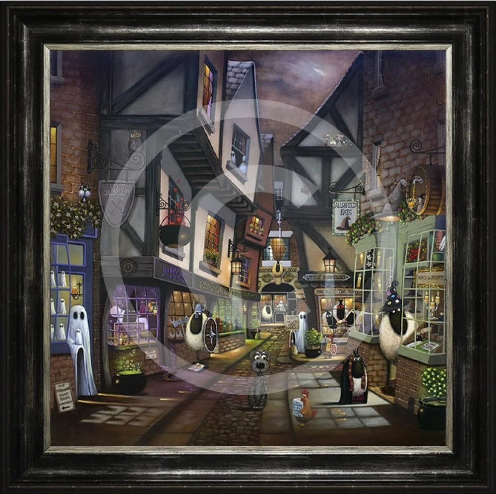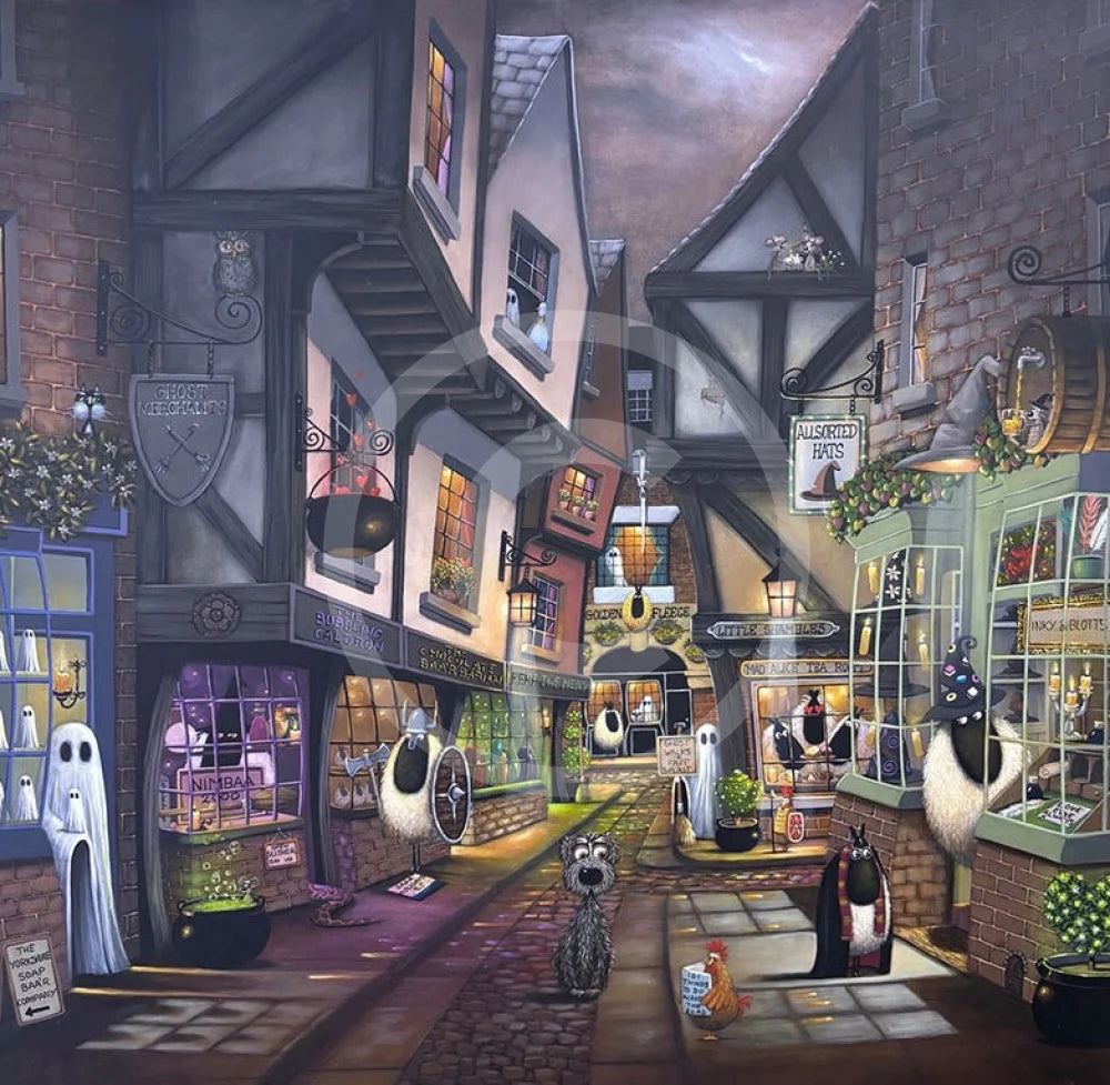 Artist Simon Clarke has produced this stunning artwork featuring York's infamous Shambles enhanced by his signature rounded fluffy sheep on the colourful cobbled street of York.