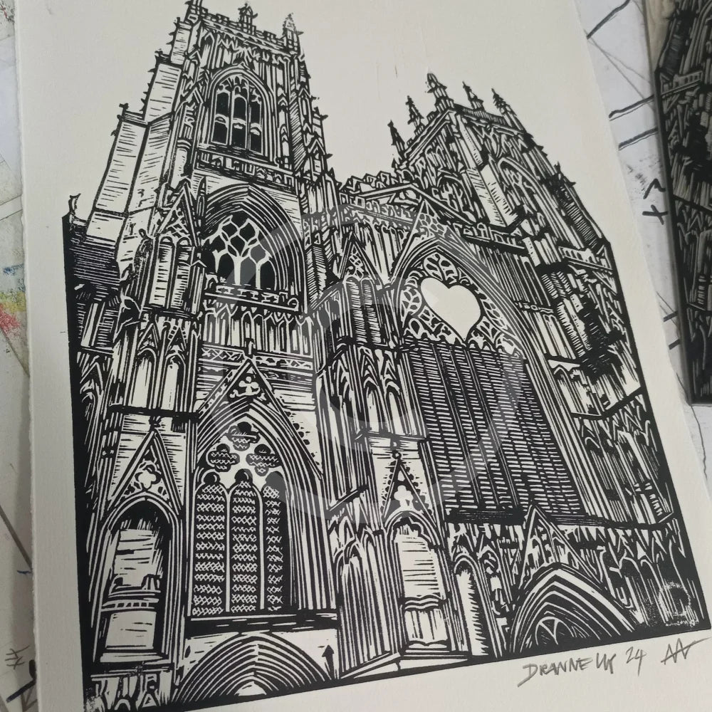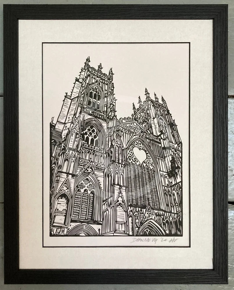 A linocut of the west front of York Minster from York based artist and print maker Drawneup.