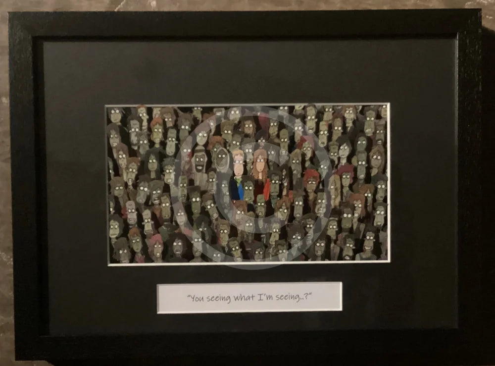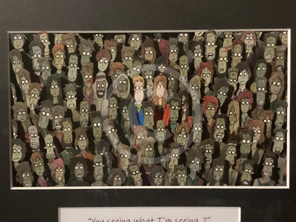 An original three dimensional watercolour. Each individual character is hand drawn and painted, then cut out and layered creating a 3D effect. Ian shows his dark sense of humour with these pandemic inspired art works. The painting is presented in a black mount with a black wood and glass frame.