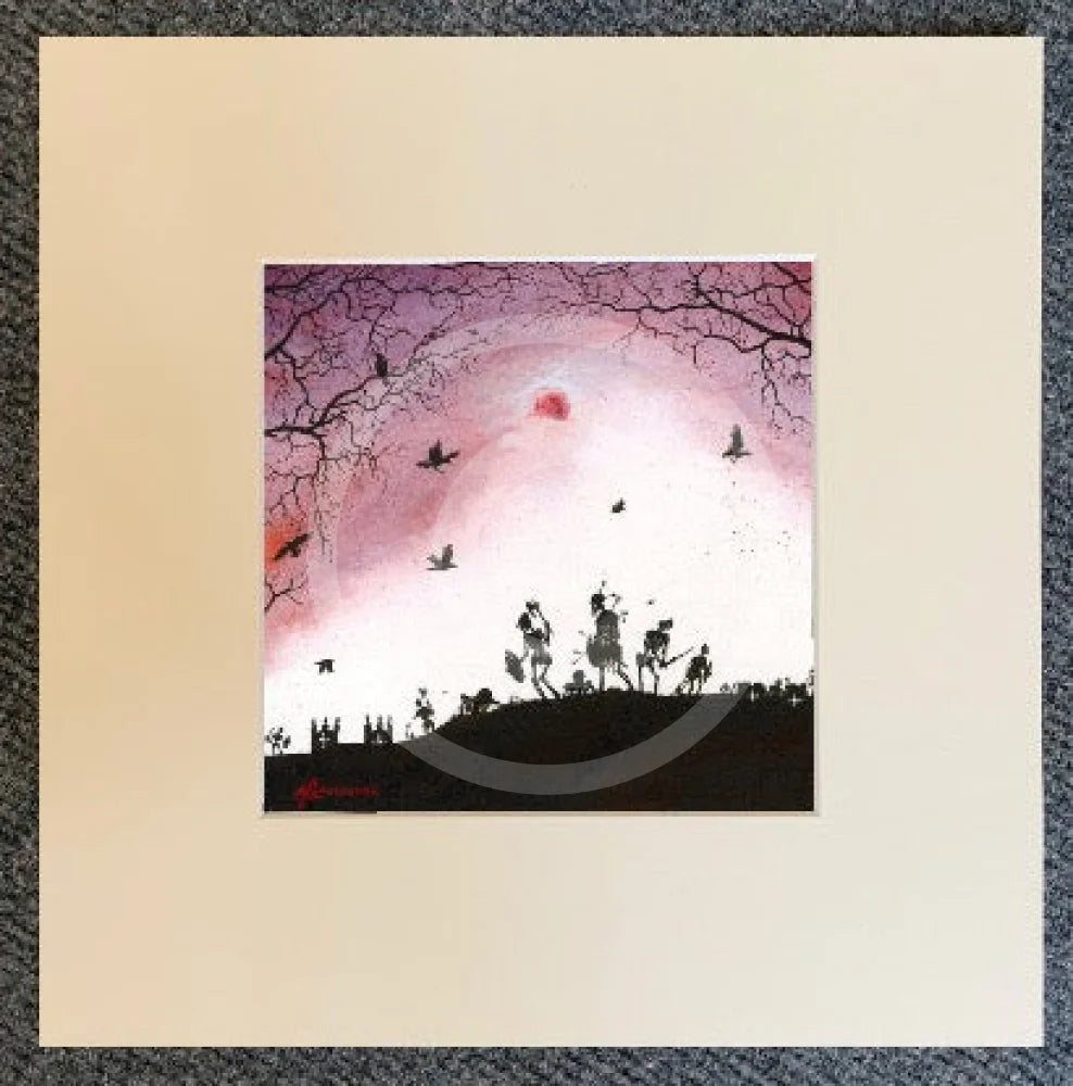 Each image is printed as a giclée on watercolour paper, image size approximately 17x17cm, and presented in an antique white 30x30cm mount; a larger 40x40cm size is available presented in a black mount.
