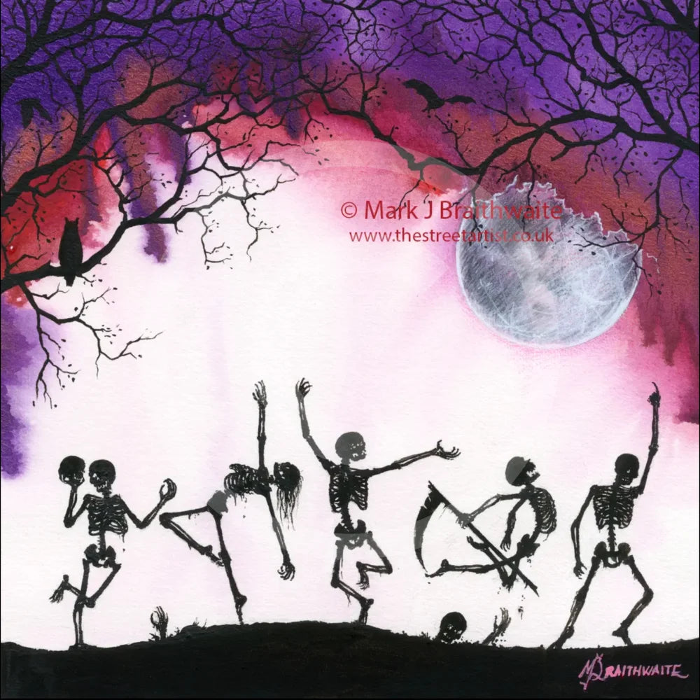 Dance of the Dead; skeletons dance whilst bats and owls circle in purple skies under the Death Moon.